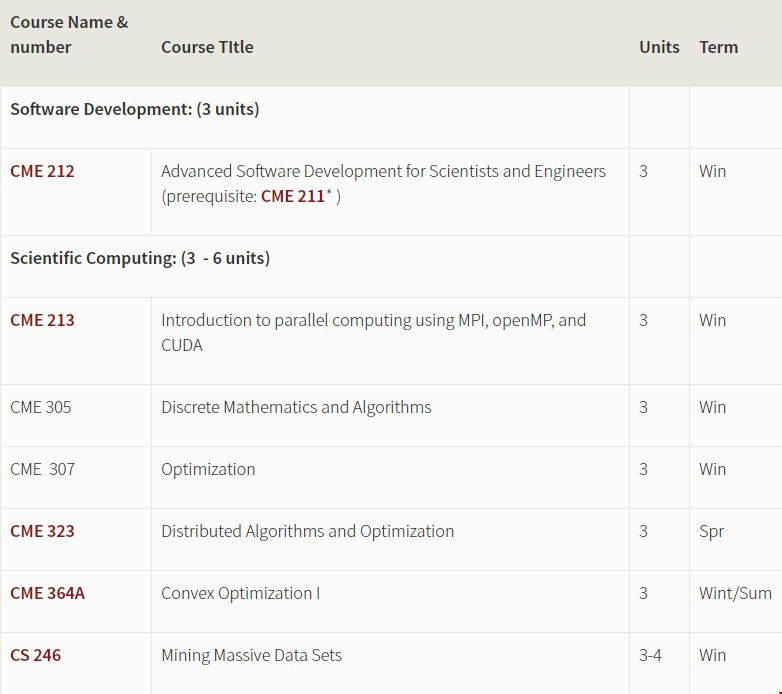 为确保学生在编程方面有坚实的基础,软件开发需要3个单元(CME212),科学计算至少需要3个单元。