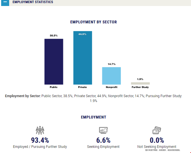 往届毕业生主要分布在以下行业:公共部门(38.5%);私营部门(44.9%);非营利部门(14.7%);继续深造(1.9%)