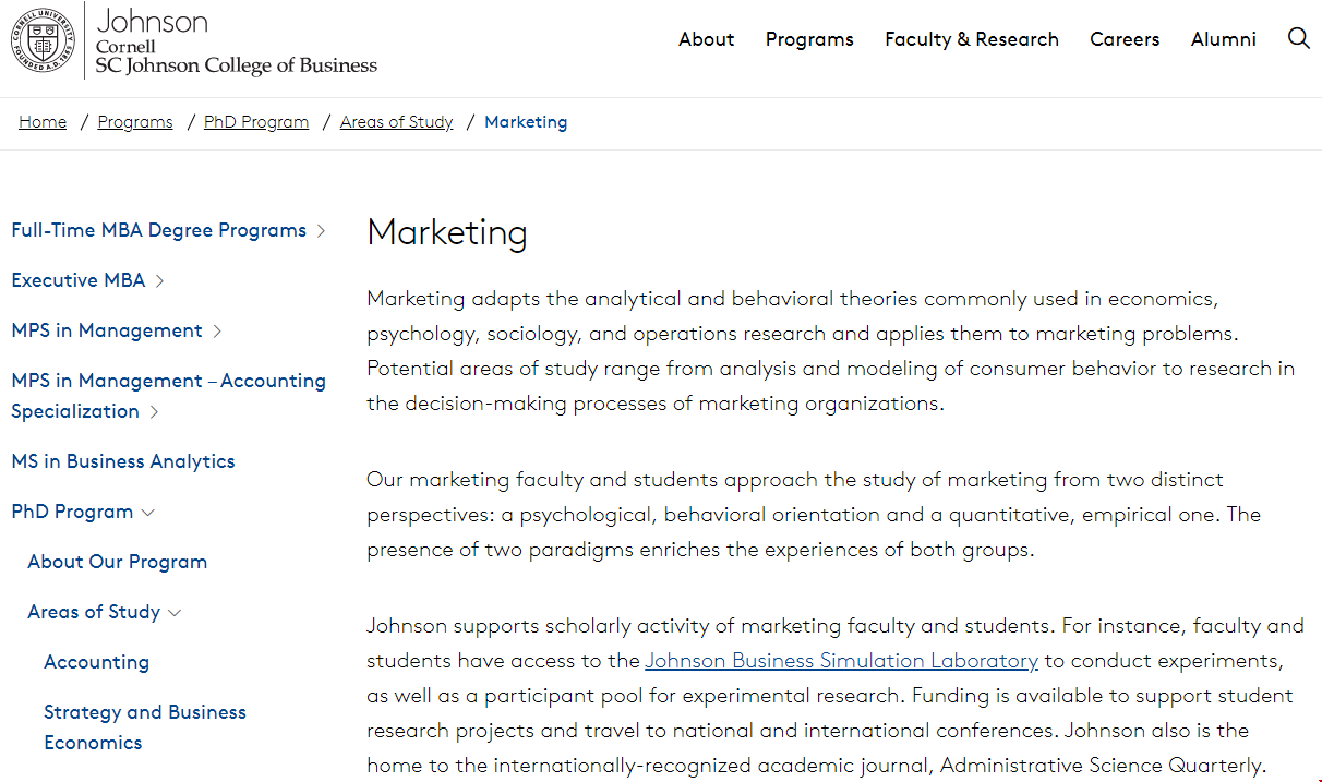 康奈尔大学约翰逊商学院非常支持营销教师和学生的学术活动。例如,教师和学生可以使用约翰逊商业模拟实验室进行实验,也可以使用参与者池进行实验研究。资金可用于支持学生研究项目和参加国家和国际会议。约翰逊也是国际公认的学术期刊《行政科学季刊》的所在地。