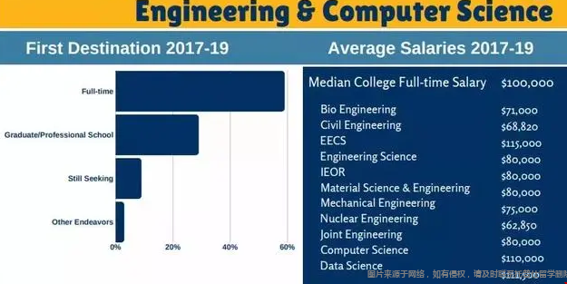 按照学院划分,薪资最高的是工程学院毕业生,平均$100,577,其次是商学院毕业生,环境设计学院和自然资源学院的毕业生薪资较低,在$55,000左右,化学学院和文理学院分别是$66,576、$79,206,不算低。