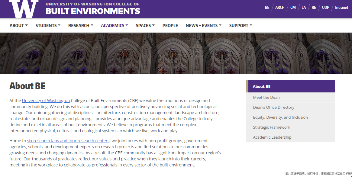 华盛顿大学开设单独的建筑环境学院,这里开设六大领域专业学科,更鼓励跨学科教育,所以跨学科项目也不少,其中教职员团队也很庞大,所以在读学生与老师的互动机会都很大,下面tops留学老师就详细给您介绍下华盛顿大学建筑环境学院(CBE)吧!