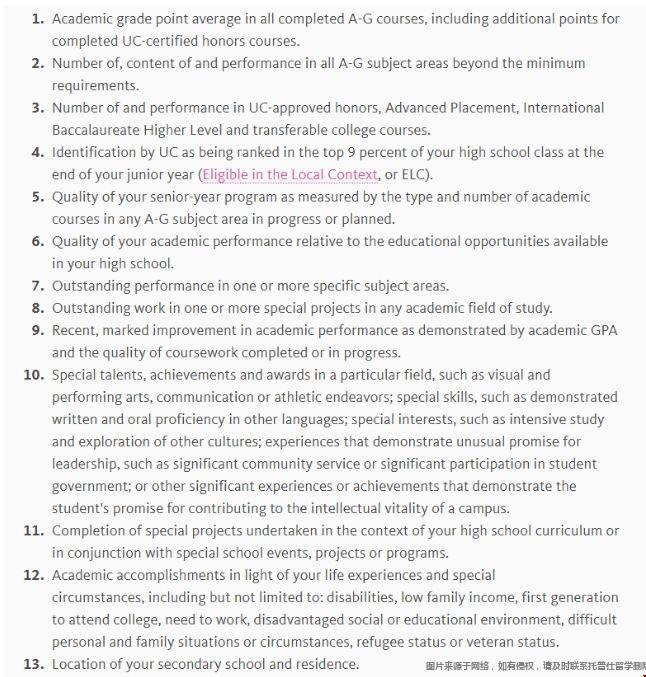 所有加州大学分校都遵循相同的政策,即在评估申请时主要有13条招生衡量因素: