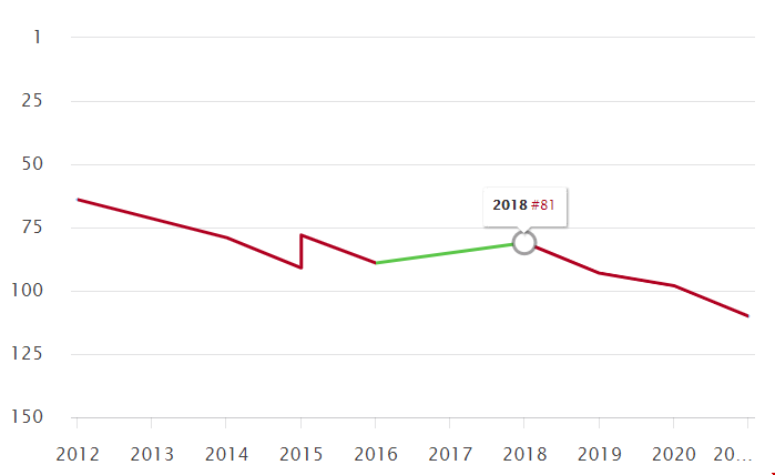 从上面的走势可以看出,波士顿大学大学近几年的排名是呈现下降的趋势的,从12年开始就一直在持续下降,仅仅在2016年到2018年有所上升。