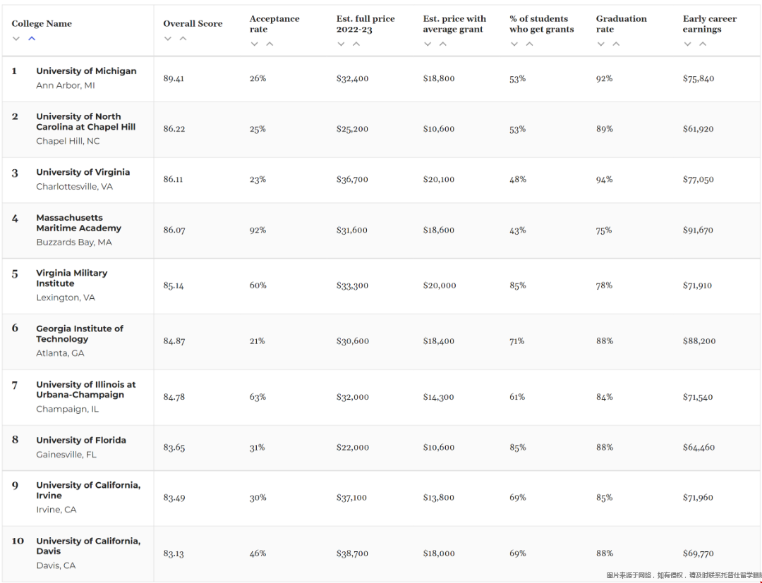 被称为“公立大学典范”的密歇根大学安娜堡分校摘得桂冠,成为全美最具性价比的王者校;北卡罗来纳大学教堂山分校和弗吉尼亚大学,这两所“公立常春藤”分别位居榜单Top 2和Top 3。此外,很多U.S.News全美综排超级低调的大学,在该榜单里有着惊艳表现。