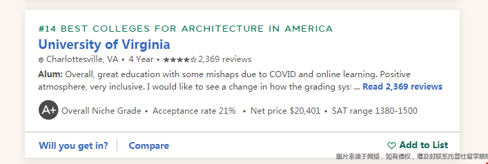 弗吉尼亚大学建筑学院在全美居于第14位,口碑评价四颗星,高于同个地区的弗吉尼亚理工学院。