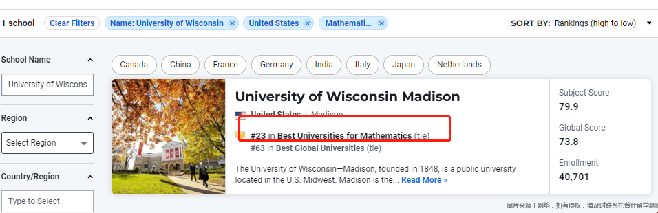 2023USnews全球大学数学学科排名中,威斯康星大学麦迪逊分校数学专业排名全美第23位,成为全美数学领域中最强势院校之一!