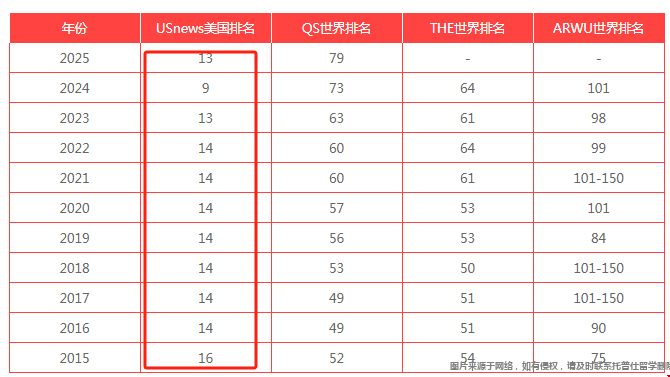 布朗大学2025USnews综合排名下滑4位,从美国第9位下滑至第13位,与2023年排名持平,与往年排名层级相符合。